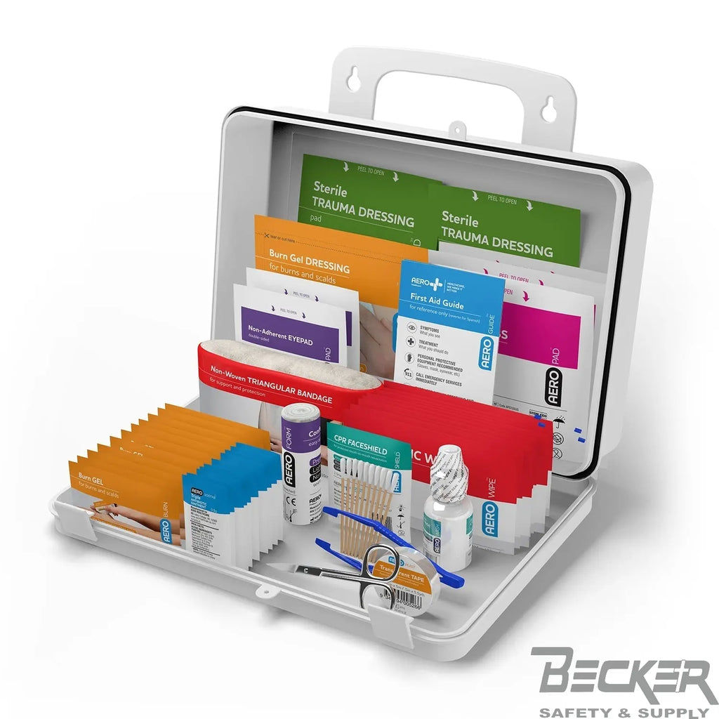 Código: SF25AW Código EAN: 9341394028876 Tamaño: 10" de largo x 3" de ancho x 7" de alto Peso: 1,6 libras Artículos por kit: 111 Cumplimiento normativo: cumple y supera las normas ANSI Z308.1-2021 OSHA 1910.151(b). Registrado ante la FDA. Clase: A Material de la caja: Plástico