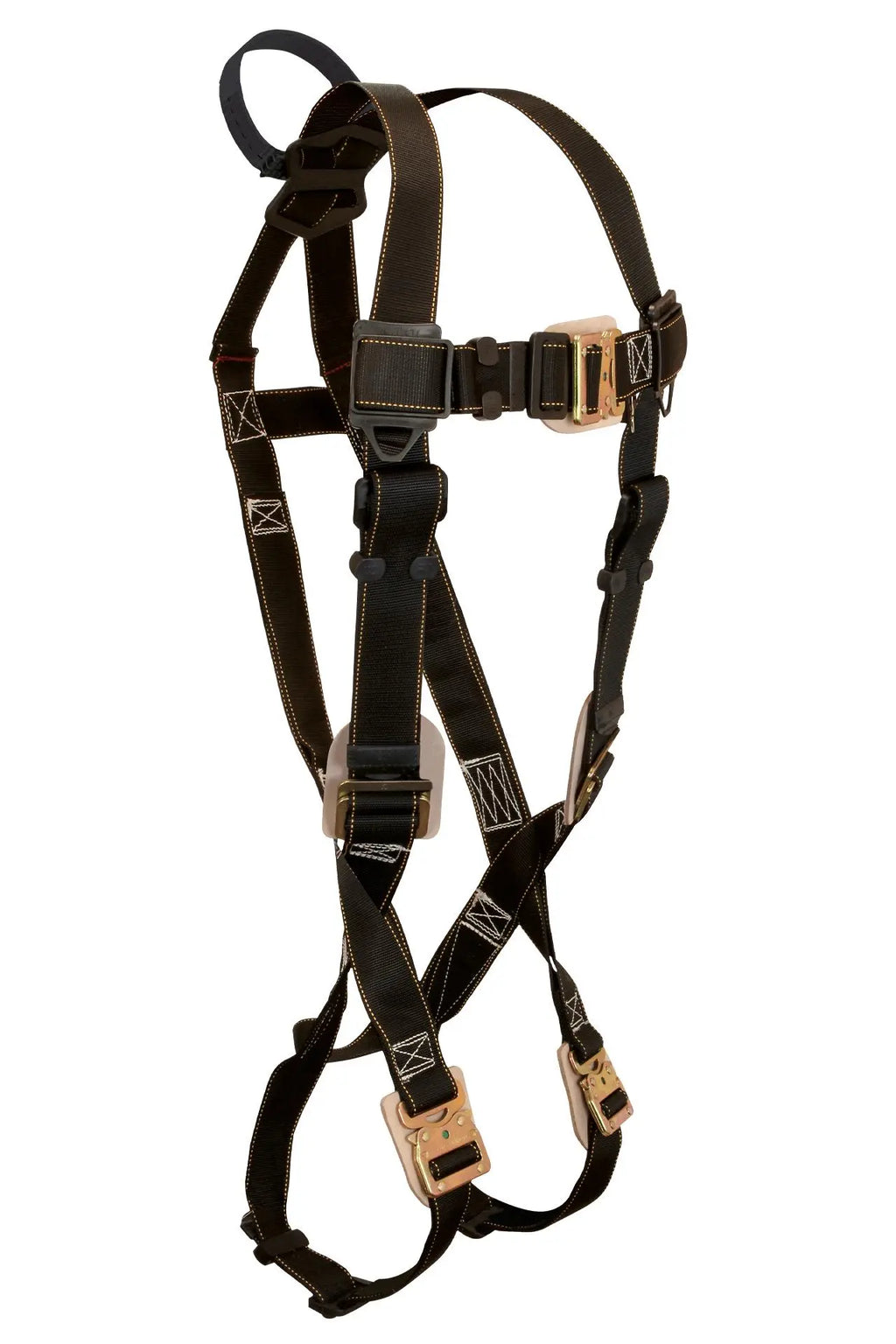 bucle web; correas de nailon; patas de conexión rápida, cofre con aisladores de cuero; ajustadores de torso con hebilla macho-hembra con aisladores de cuero; Bucles de rescate de torso delantero emparejados