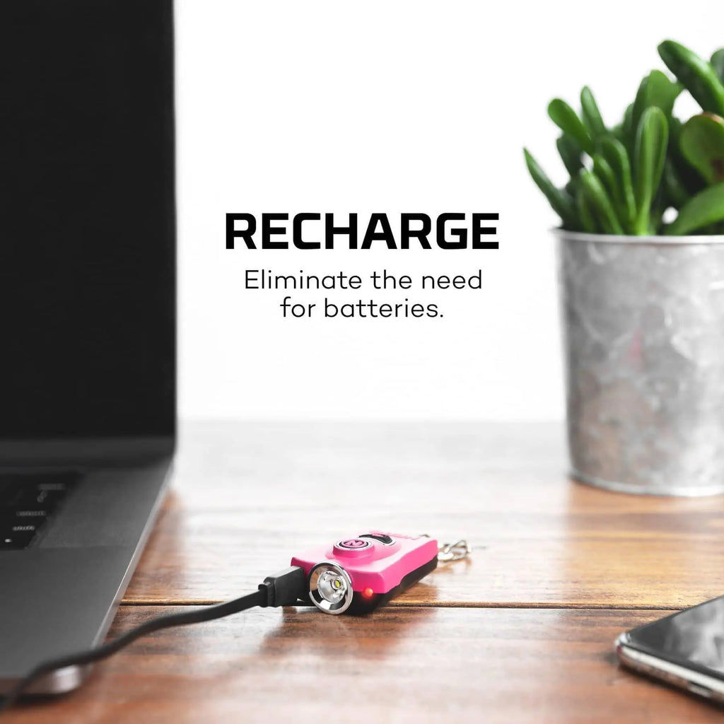 Llavero recargable con luz y alarma de seguridad Los diversos modos de luz del MYPAL lo hacen perfecto para cualquier emergencia o tarea, y el modo TURBO de 400 lúmenes puede iluminar cualquier espacio. El MYPAL también cuenta con una alarma de seguridad de 115dB que perfora los oídos y una luz estroboscópica de socorro para brindar seguridad al alcance de su mano. El tamaño compacto de MYPAL cabe perfectamente en un bolso o en un llavero.