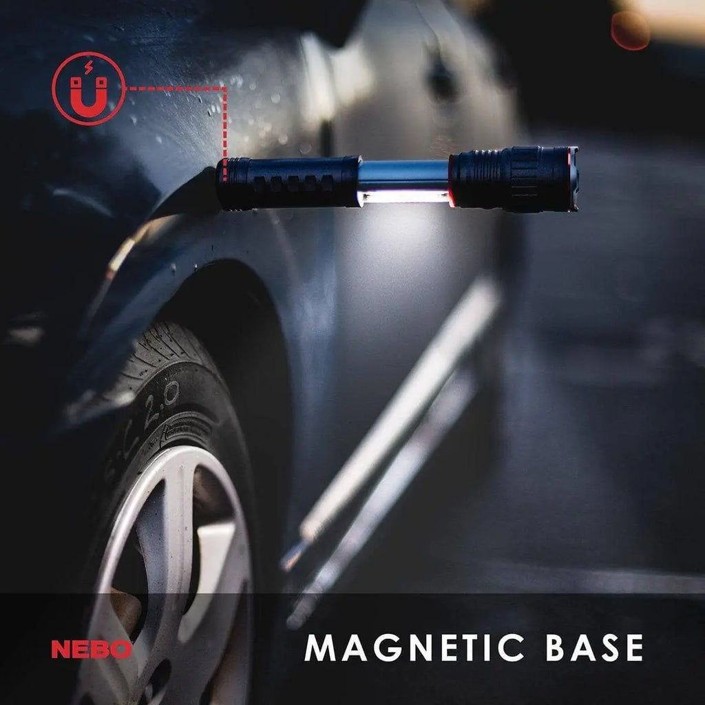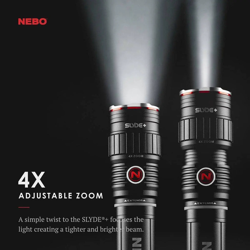 Linterna táctica LED con base magnética La SLYDE+ es una luz perfecta para tener en casa en caso de emergencia. El SLYDE+ viene equipado con una potente linterna, luz de trabajo deslizable para revelar, configuraciones de memoria programables para cada modo de luz, una función de luz roja C•O•B con luz roja intermitente para señalización de emergencia, un zoom ajustable de 4x y deslizamiento instantáneo !