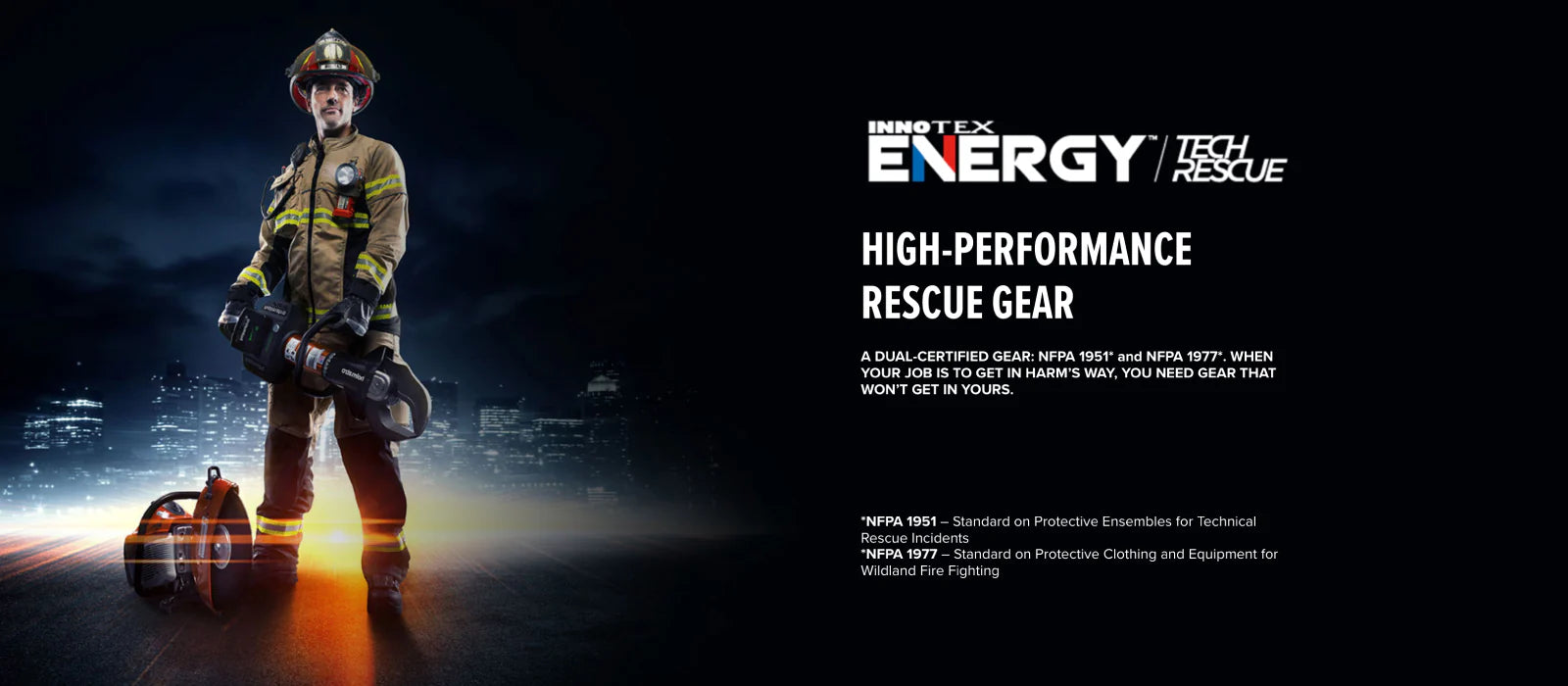 Patterned after its industry-acclaimed namesake, INNOTEX® ENERGY™ Tech Rescue offers great ergonomic comfort and ease of movement, while delivering the complete protection first-responders need. In a lightweight package and a fitted-cut, Tech Rescue is a game changer for fighting wildland fires AND for technical rescue situations.