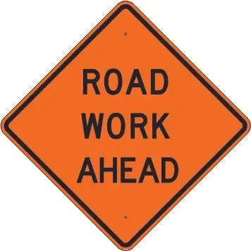 ROAD WORK AHEAD .80 Aluminio, con láminas reflectantes HIP. Orificios de montaje pretaladrados y esquinas radiales donde corresponda. Negro sobre naranja 48"