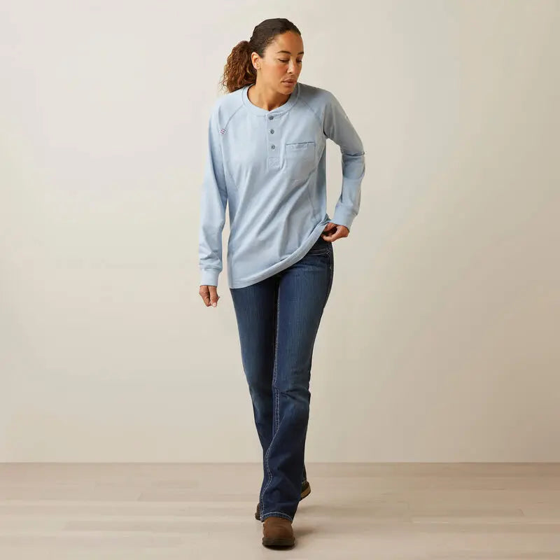 Step into safety without sacrificing style with the ARIAT WOMENS FR AIR HENLEY – where functionality meets fashion.